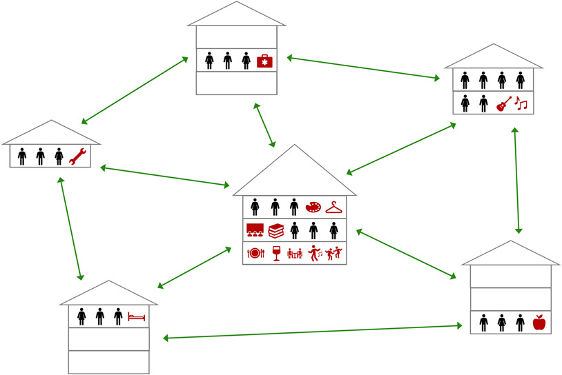 Durch das Netz wird eine Anzahl Bewohner:innen erreicht, die den Betrieb verschiedener gemeinschaftlicher Einrichtungen möglich macht. Somit wird der effektiv zur Verfügung stehende Wohnraum um ein Vielfaches grösser als das eigene WG-Zimmer! Das Teilen und Zusammenarbeiten macht das Leben zudem nicht nur günstiger, reichhaltiger und sozialer, sondern auch ökologischer.